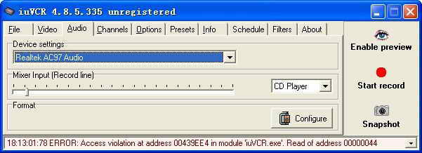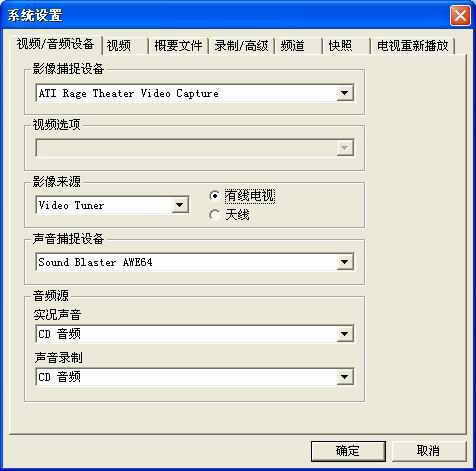 这里以我用的All-In-Woder 128 Pro为例为大家讲解iuVCR的使用方法(其他同类产品用法相同)。运行iuVCR,首先要对该软件进行设置,“Video”中,在“Divice settings”下点选“Cofigure”,将属性选择为中国电视所对应的PAL_D制式,然后保存。“Audio”项中,“Mixe Input”下选择“CD Player”(图5)。“Audio”项的Configure中是对声卡和音质的设置,可由大家随意选择,不过如果要考虑录像,建议还是选择MPEG Laery-3格式。同时,在“Options”中的“Synchronization”里,将除“Short audio samples”之外的项全部选上。