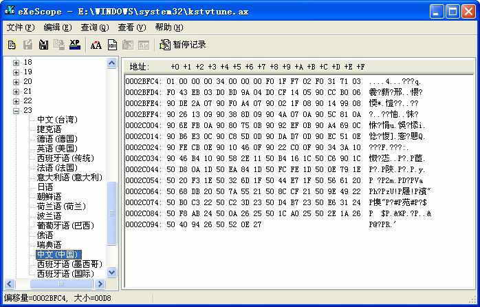 说到DIY,我们先要弄明白,电视卡是如何搜台的。目前,随电视卡附赠的软件(例如ATi All-In-Wonder系列的MMC、品尼高的PCTV vision等),这些软件内载频道表,而像PowerVCR之类的软件是没有频道表的。事实上,PowerVCR是调用Windows自带的频道表kstvtune.ax(Win98/Me系统中路径为windows/ kstvtune.ax;Win 2000/XP系统中路径为windows(winnt)/system32/ kstvtune.ax)来完成搜台工作的。我们可以用eXeScope(下载地址为http://www.onlinedown.net/soft/9594.htm)修改kstvtune.ax中的数据。用eXeScope打开kstvtune.ax文件,在“资源/RC数据23(Resource/RCDate/23)”中的数据就是代表中国的,选择你的系统语言的那一栏进行修改,它的头8位(两个数字为1位,下同)是“01 00 00 00 34 00 00 00”(图3)。