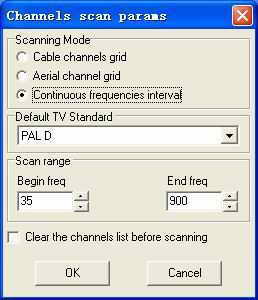 “Channels”项是电视频道的搜索,制式仍为PAL_D,点选“Scan”出现“Channels scan params”对话框。此时“Scanning Mode”中默认为第一项,请务必选第三项“Continuous frequencies interval”,这是按频率搜索。这样你可以收到本地传送的全部的频道了(图6)。此处左侧所列出的频道清单中也列出了相应频道的发射频率(图7中的9位数),如果你只是要看看电视,也许不会对此感兴趣,但如果你要用PowerVCR,这个频率就不能不关注(见前文)。