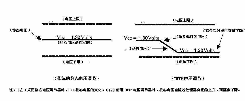 增强型SpeedStep所提供的多个频率断点的优势在于可以让处理器根据应用程序选择所需的运算能力,在性能和功耗间取得最理想的平衡。增强型SpeedStep之所以可提供多个电压/频率工作点,奥秘在于英特尔开发的IMVP(Mobile Voltage Positioning)移动电压定位技术,该技术完全取决于处理器而不需要芯片组支持。右图可以解释它的运作原理。