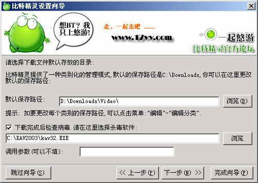 BitSpirit(比特精灵)是一款深受好评的BT下载工具,其实它也支持调用杀毒软件的功能。初次安装并运行比特精灵时,会弹出配置向导,在“选择下载文件默认存放目录”的窗口中勾选“下载完成后检查病毒”,并填入杀毒软件执行程序的路径即可(图2)。如果更换了杀毒软件,大家可以在比特精灵主界面的“工具栏→选项→设置向导”中调整。