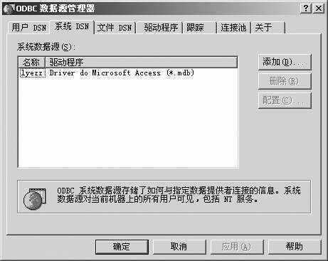 单击“开始→程序→管理工具→数据源(ODBC)”,在“ODBC数据源管理器”的“系统DSN”选项卡中单击“添加”;在“创建新数据源”中选定“Driver to Microsoft Access(*.mdb)”,单击“完成”;在“ODBC Microsoft Access 安装”窗口中设置数据源名为lyez(可随意填),单击“数据库”中的“选择”按钮,在“选定数据库”窗口中选定前面已创建的数据库zs.mdb,确定后回到“ODBC Microsoft Access 安装”窗口,再次确定后返回到“ODBC数据源管理器”窗口完成数据库驱动程序的添加设置(图1)。