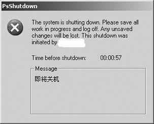 双击该快捷方式便可以在对方的电脑上看到关机提示窗口(图1)。若要中途取消关机操作,实现方法和方式1中所介绍的差不多。将psshutdown命令拷贝到客户机相应的目录下,然后在客户机的“运行”框中输入“psshutdown -a”(参数-a表示中断正在倒计时的关机操作)即可。