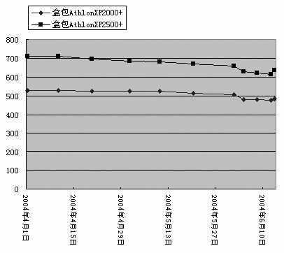 长期以来,处理器两大巨头AMD与Intel的市场竞争都很激烈,但不管怎么样,双方的CPU价格都基本上础平稳下滑状态。但是进入了今年6月以后,AMD的CPU价格就开始了一连串的跳水,短短10天左右,主流的盒装AthlonXP2500+几乎有近10%的降幅。但是从6月12日起,AMD的处理器产品又进入了涨价状态,短短一天之内,盒装的AthlonXP2500+价格涨了近15元,真是活跃异常。