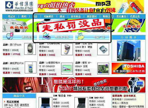 目前由于市场的激烈竞争,电子和数码产品的毛利率不是非常高,就算高,也不可能达到100%。也就是说,这家公司的报价对于厂商来说也许连成本价都不够!我们注意到网站的首页写着“走私罚没品”(见左图),难道真的有上千种时尚的数码、PC产品被罚没收了吗?即使是罚没品,如此销售也是违法的!
