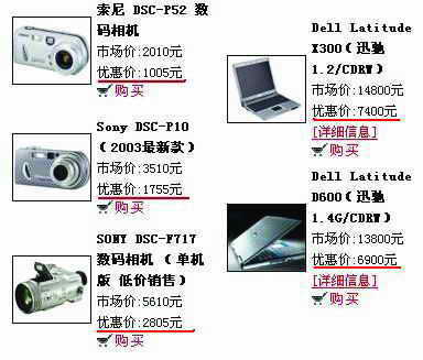 通过对该公司网站的浏览,我们发现这家公司似乎是相当有实力的,经营的产品非常丰富,品种差不多有近千种。并且几乎每一件商品的价格都非常便宜(见右图),基本上都是市场价的一半左右。比如:Dell Latitude X300笔记本电脑报价只要7400元,Intel P4盒装 2.4GHz处理器的报价只有760元。真的都是惊人的低价!