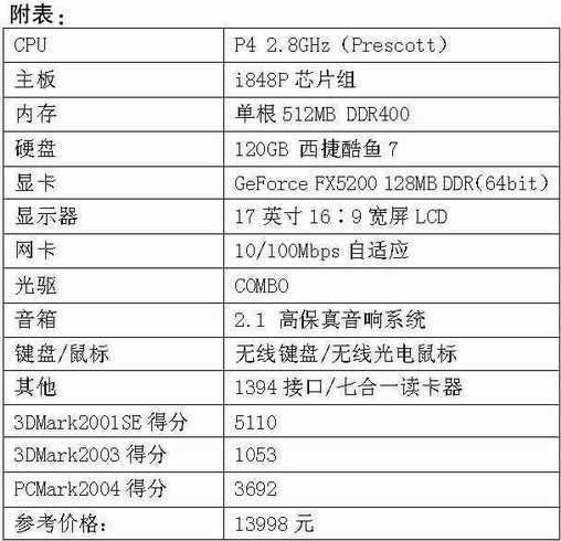 天骄S9000M采用了Prescott 核心的2.8GHz Pentium 4处理器、512MB DDR400内存、128MB GeForce FX5200显卡及120GB的7200转/分西捷硬盘。硬件配置虽然谈不上顶级,但满足家庭工作、多媒体娱乐及普通3D游戏的需要已经绰绰有余了。令人不解的是天骄S9000M的主板采用了i848P芯片组主板,并没有采用支持内存双通道技术的i865PE芯片组主板。