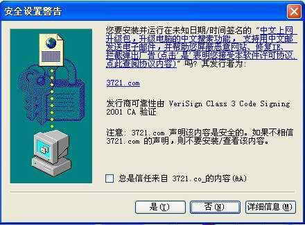 在访问3721的网站时(http://www.3721.com),每次打开网页都会弹出图1所示安全提示框;在访问3721的任一合作伙伴网站时,也会弹出相同的对话框,不同的是对同个IP用户一天只弹出一次。