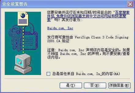 在百度的首页(http://www.baidu.com)没有弹出过安装提示框,可以通过点击链接“搜索工具”进入百度搜霸的首页,再选择“搜索伴侣”进入搜索伴侣首页即会弹出图2所示安全提示框;在百度的合作伙伴网站,每次都弹出安装提示框。