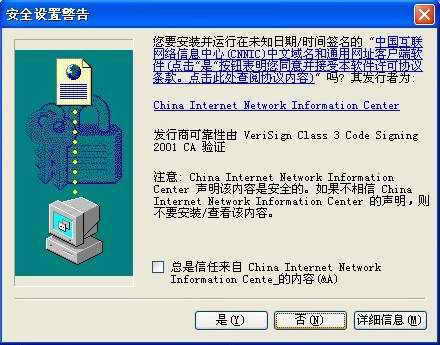 在CNNIC(http://www.cnnic.net.cn)的首页选择“通用地址”进入(即http://www.cnnic.net.cn/index/OC/index.htm),就会弹出图3所示安全提示框;在CNNIC的合作伙伴网站一般都不会自动弹出安装提示框,而是有一个链接介绍通用网址,然后让用户去链接CNNIC的安装页面。
