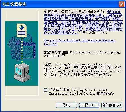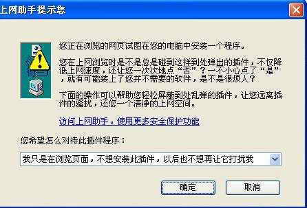我们选择这4款插件,除了功能上的原因外,还由于它们推广方式的特殊性,如有的插件不仅在自己的主页会弹出安装对话框,而且在自己的合作站点也会弹出同样的对话框,如3721网络实名和百度IE搜索伴侣,有的则依靠自身网站巨大的用户访问量来推广,如新浪点点通。因此用户在上网时,有较多的几率会接触到这4款插件的安装弹出框。对普通用户来说,由于没有经验,因此这些插件的安装会对他们造成更多的“困扰”,不知该如何取舍。