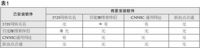例如3721网络实名,安装了它之后,再安装CNNIC通用网址和百度IE搜索伴侣,就必须先卸载它;同样,如果先安装的是百度IE搜索伴侣或CNNIC通用网址,再安3721网络实名,也要卸载百度IE搜索伴侣或CNNIC通用网址才行。