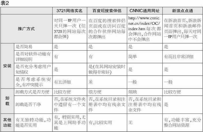 小结:这点上新浪点点通做得最好,让人非常清楚它的每一项功能及使用方法,其次是百度IE搜索伴侣和3721网络实名,CNNIC通用网址在这方面做得比较简单。