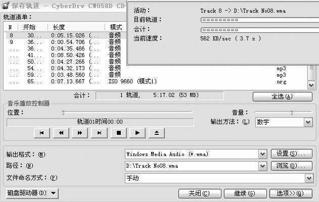 我正准备放弃,无意中打开了Nero Burning ROM 6,发现Nero中的“其他选项”下有一个“保存轨道”的选项,我想:用Nero把CD的音轨复制下来不就好了?说干就干,我再次塞入CD,打开Nero“保存轨道”的选项。Great!CD中所有的音轨都在Nero下显现了出来,在选好了要拷贝的所有音乐和将要保存的格式以及路径后,按“继续”,复制的进度条顺利地动了起来(图3)。随后,我将全部14首歌全部传入了YP-520,打开后,莎拉布莱曼婉转的歌声顺利地从耳机中传了出来!