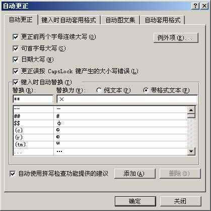 2.选定符号“×”,单击菜单“工具→自动更正”,弹出“自动更正”对话框,选择“带格式文本”,在“替换”文本框中输入“**”,单击“添加”和“确定”。