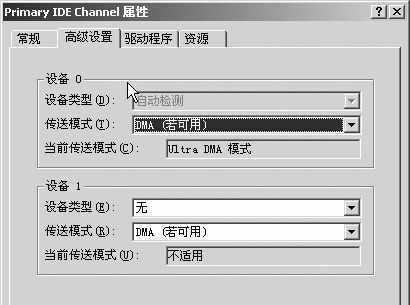 听到这里笔者有点明白了,是不是这根被剪断的IDE排线引起的故障呢?拿来一根完好的80线IDE数据线换下被剪断的IDE数据线,硬盘仍旧接在排线末端,启动计算机能进入Windows,看来故障还真在这儿。但是为什么呢?理论上说,剪去第一个插口,并不影响数据线的正常使用。插头的变化只不过引起主盘和从盘的变动而已。笔者打开设备管理器,查看硬盘的设置,发现Primary IDE Channel 和Sencondary Ide Channel中的IDE“设备0”为自动检测,而“设备1”被设为“无”(如图所示)。