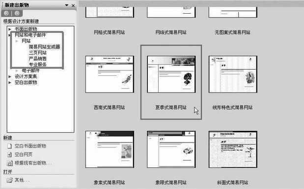在Publisher中可以利用功能强大的向导来创建网站,也可以直接创建空白网页进行设计。选择“文件→新建”会在界面上出现“新建出版物”的任务窗格(图1),单击“网站和电子邮件→网站”弹出“简易网站生成器”、“三页网站”、“产品销售”和“专业服务”等网站类型的菜单,你可以根据建站的需要来选择其中的一种。若需自由定义我们的网站就点击选择“简易网站生成器”,这时在主界面上会出现大量的简易网站模板缩略图可供选择,点击一个你喜欢的样式吧。