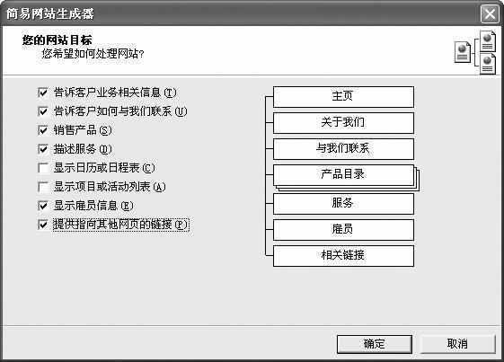 Publisher在加载网页模板样式之后会弹出一个“网站目标”窗口(图2),在这里就可以根据具体需要来定义网站功能了。比如你想在网站里加入“关于我们”的页面就勾选“告诉客户如何与我们联系”选项,选择完毕按“确定”后进入“个人信息”设置窗口,按照提示输入你的姓名、地址等相关个人信息,按“确定”后,网站就创建成功了。