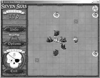 进入游戏,迎接你的是一个可爱的独眼骷髅头,海盗味十足。茫茫大海上,有你的一只白帆船和几只海盗船。我们的目的是把所有海盗船干掉,因为它们都想要来撞翻你。一开始你有三次生命,挂了三次就Game Over了,不过,如果你玩得好,几局后生命会增加。规则是双方轮流各走一步。每只船每次只能前进一格。你可以开炮打它们,炮的射程是你左右两侧3格的范围内。