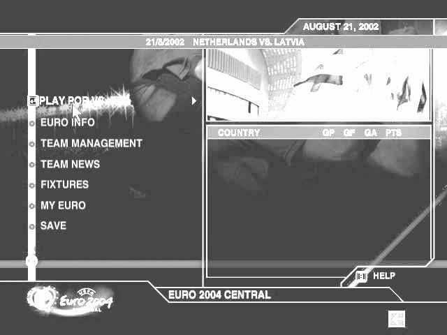 进入该模式首先选择新建或者载入锦标赛,进入锦标赛菜单,PLAY和SIM分别是开始比赛和直接获得比赛结果;EURO INFO为查看有关欧洲杯信息和对手信息,包括积分表、比赛赛程、球员状态、射手榜等信息,还可以设置比赛难度、半场时间和受伤开关;TEAM MANAGEMENT为球队管理,设置出场球员、指定罚球队员和球队阵形打法,其中球员新增了MORALE即球员状态一项;TEAM NEWS为球队信息,在GENERAL中察看球员状态的提升和下降,球员会因为球队获胜、首发、进球、转会等原因使状态提升,也会因为球队失利、没进主力名单等原因使状态下降,调整队员的状态在游戏中变得很重要。在FITNESS中察看球员的伤病情况,可以分别察看球员的重新上场时间、受伤部位和受伤类型(比如软骨挫伤、肌肉拉伤等),SUSPENSIONS中察看红黄牌和停赛情况;FIXTURE为比赛日程,可以查看友谊赛和锦标赛日程,并可以在未安排比赛(OPEN)的日子选择球队进行友谊赛;MY EURO为游戏设置,设置比赛时间,难度,游戏分辨率,音乐等;SAVE为保存进度。