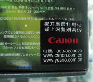 目前不少厂家都在自己的产品包装盒上贴上防伪标贴,我们可以在购买后刮去表面涂层,看到一组密码和一个电话号码,通过电话查询密码可以验证产品的合法性。值得注意的是,少数商家想出了调换包装盒的办法蒙混过关,所以我们在购买时,应该首先检查相机机身的序列号和包装盒上的号码是否一致。此外,在没有决定购买相机时千万别去自做主张刮开涂层啊,否则这台机器你就必须买下了。