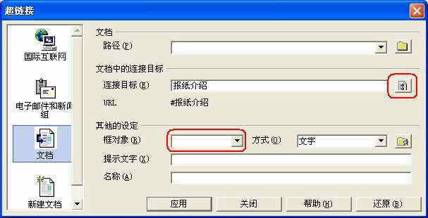 小贴士:其中“框对象”中的选项代表了链接目标的打开方式,常见的主要有“_blank──在新窗口打开”和“_parent──在自身窗口打开”,请根据需要选择确定。