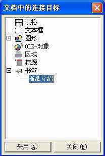 3.在左侧窗口中选中“文档”选项,然后按“链接目标”右侧的“浏览”按钮,打开“文档中的连接目标”对话框(图3),展开其中的“书签”,选中相应的书签(如“报纸介绍”),点击“应用”和“关闭”按钮返回。