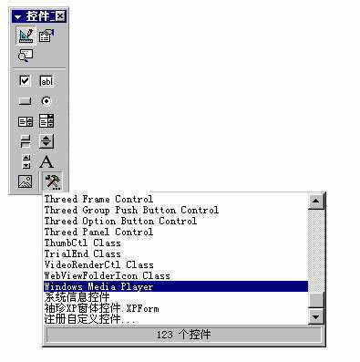 2.点击工具栏右下角的“其他控件”图标按钮,在弹出框中选“Windows Meadia Player”(图1),这样就插入了一个媒体播放器窗口。