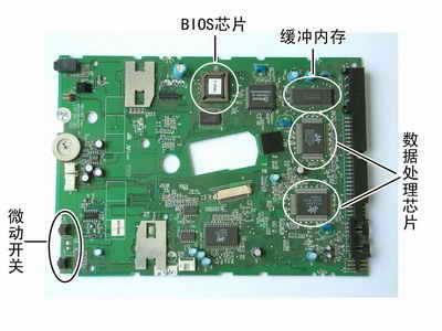 将光驱底部向上平放,用十字螺丝刀拆下固定底板的四颗螺钉,再用手向内推底板上的塑料卡销,向上取下金属底板,这样就可以将面板拆下来了。此时已能看到光驱底部的PCB电路板了,如图1。