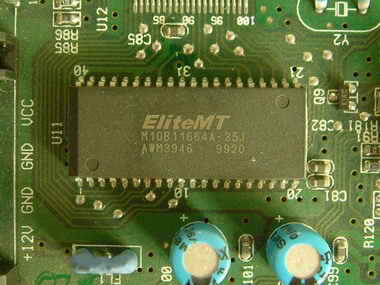 PCB板中比较重要的是光驱的Cache(缓冲内存,简称缓存)芯片,图2是一片EliteMT品牌的缓存芯片,容量为128KB。普通CD-ROM或DVD-ROM的缓存大小一般只有128KB或256KB,最大不会超过512KB。而刻录机则要大得多,一般为2MB或8MB,用于防止缓存欠载(buffer underrun)错误,同时可以使刻录机平稳、恒定地工作。