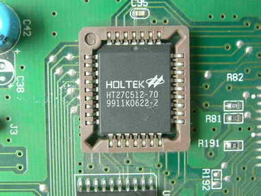 和主板、显卡、Modem等配件一样,光驱也有BIOS,如图4。这是一片由HOLTEK公司生产的芯片,型号为27C512,属于EPROM芯片,容量有512KB,不可刷写。所以该光驱不能够通过软件来更新Fireware(固件),大多数光驱均采用了可刷新的Flash ROM。