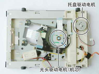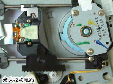 把光驱的托盘卸下,就能看到整个光驱的驱动电路了,光驱的所有机械部件都在这里,如图5。可以看到上面有两个电机,中央的那个用来驱动激光头,而靠边上的那个则是用来驱动光驱托盘的,即你平时放碟片的地方。