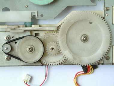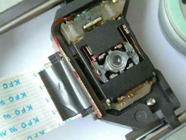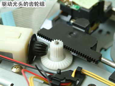 图6为带动托盘运动的齿轮和皮带,托盘的弹入弹出就是依靠这个组件。齿轮或皮带坏了就会导致弹入/弹出时托盘被卡死,这是光驱最常见的故障之一。图7则是光驱的核心部分──激光头的驱动组件。