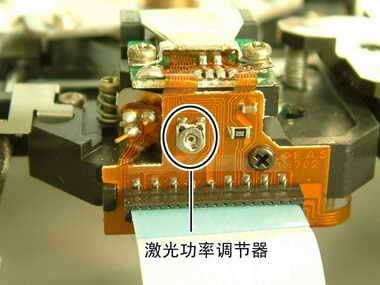 将激光头组件转一个角度,我们就能看到一个金属变阻器(图11),这个可调变阻器就是用来调整激光功率的。如果光驱太旧,很难读取光盘数据时,可以尝试着调整它,一般情况下逆时针旋转变阻器,每次旋转5°左右即可,最多不要超过10°,直到可以顺利读出光盘为止。因为电流一旦超过150mA,就很有可能烧毁激光头。且旋转之前最好作个记号,别调大了。