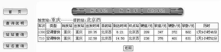 这里M牛查询的是重庆到北京的列车时刻表,为的是从北京转车到承德避暑山庄。首先点击页面左侧的“站站查询”按钮。在出现的窗口中,首先选择发站,通过下拉框选择地区,如重庆市,再选择站名,如重庆;之后在到站中,通过下拉框选择地区,如北京市,再选择站名,如北京西。最后点击“确定”按钮就可以查询到相应的结果,包括车次、出发时间、到达时间、各种票价及历时信息(图1)。