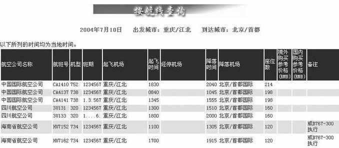 如果你想知道某条航线飞机航班的情况,你可以在“按航线查询”中输入相应内容进行查询。比如要查询2004年7月10日从重庆江北机场出发到北京首都机场的所有航班信息,你可以在“出发城市”中选择“重庆/江北”机场,接着在“到达城市”中选择“北京/首都”机场,然后在“出发日期”中选择“2004年7月10日”,最后点击“查找”按钮就可以查询到2004年7月10日重庆到北京的所有航班信息(图2)。