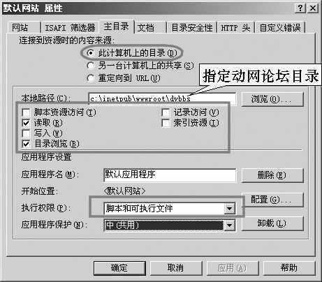 在“主目录”选项卡中,将内容来源定为“此计算机上的目录”,并将本地路径设置为“C:\interpub\wwwroot\dvbbs”。勾选“读取”和“目录浏览”两个复选框来设定论坛的对外权限,再将论坛的执行权限设定为“脚本和可执行文件”即可(图1)。