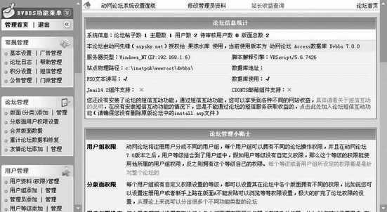 点击“管理”链接进入论坛的管理页面。页面左侧是功能菜单,我们只要点击需要设置的项目,在右侧窗口便会显示该项目的具体设置内容(图2)。在此,果冻针对自己的需要进行了一番设置。