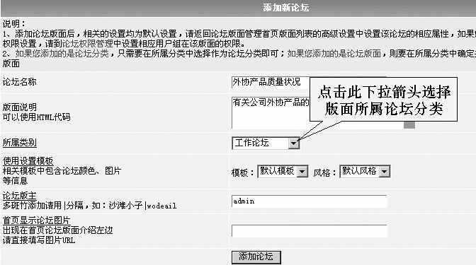 果冻首先添加了一个论坛的分类,如工作论坛(这可是本次任务的中心,领导非常关注)。点击管理功能菜单中的“版面(分类)添加”,在右侧窗口中输入论坛的名称、版面说明,并设置好该论坛的版主(当然非领导莫属了),然后点击“添加论坛”按钮即可。