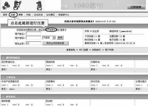 至此,论坛的架设总算完成了。内网用户只要在浏览器地址栏中输入192.168.1.6(即架设论坛的电脑在局域网内的IP地址),便可以进入这个由果冻精心打造的论坛。点击“注册”即可进入注册页面“领取”论坛的合法身份(图4)。