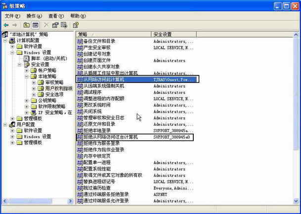单击“开始→运行”,在运行框中输入“gpedit.msc”,在组策略窗口中依次展开“本地计算机策略→计算机配置→Windows设置→安全设置→本地策略→用户权利指派”(图1),在右栏中找到“拒绝从网络访问这台计算机”项,打开后删除其中的Guest账号,接着打开“从网络访问此计算机”项,在属性窗口中添加Guest账号。这样就能使用Guest账号从网络中访问该机的共享资源了。此方法适用于Windows 2000/XP/2003系统。