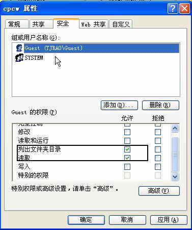 网络中很多机器使用 NTFS文件系统,它的ACL功能(访问控制列表)可以对用户的访问权限进行控制,用户要访问这些机器的共享资源,必须赋予相应的权限才行。如使用Guest账号访问该机器的CPCW共享文件夹,右键点击该共享目录,选择“属性”,切换到“安全”标签页,然后将Guest账号添加到用户列表中,接着指定Guest的访问权限,至少要赋予“读取”和“列出文件夹目录”权限(图2)。如果想让多个用户账号能访问该共享目录,只需要添加Everyone账号,然后赋予“读取”和“列出文件夹目录”权限即可,这样就避免逐一添加和指定每个用户访问账号。此方法适用于采用NTFS文件系统的Windows 2000/XP/2003系统。