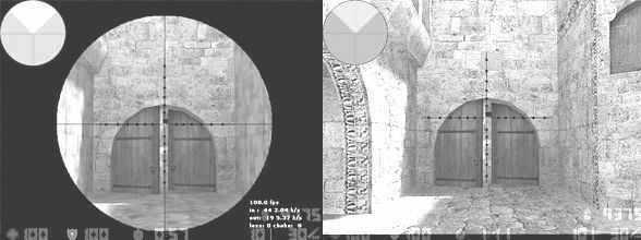 今年4月29日Steam曾经有一次比较重大的升级,增加了切换到狙击枪时的开镜延迟,但人们很快就发现当你使用software的显示模式(平时大家通常都用OpenGL)玩游戏的时候,狙击枪开镜后原先边上的黑色区域就会消失!不过Valve马上就在下一次升级中作了修改。