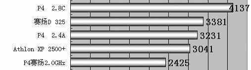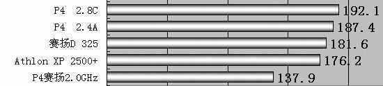 在针对处理器的单项测试中,频率最高,并且是这几款处理器中惟一支持HT技术的P4 2.8C GHz表现出了最好的性能,而赛扬D 325测试得分比P4 2.4A GHz还要好,P4赛扬2.0GHz得分垫底。在内存性能上,支持800MHz前端总线的P4 2.8C GHz性能再次领先,Athlon XP 2500+测得的内存性能不太好。