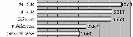 可以认为P4 2.8C GHz处于第一方阵,而P4 2.4A GHz 、Athlon XP 2500+和赛扬D 325大体上础第二方阵,P4赛扬2.0GHz综合性能殿后。