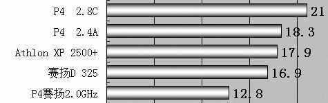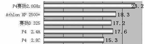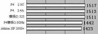在MP3压缩上,P4 2.8C GHz和Athlon XP 2500+都很快,频率稍高的赛扬D 325比P4 2.4A GHz稍稍快上一点。P4赛扬2.0GHz用时最长。