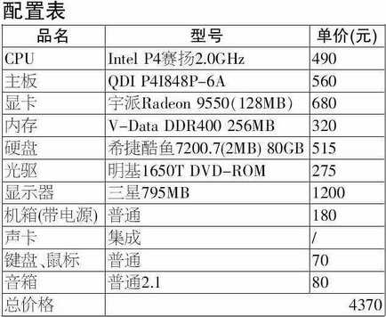 这样的平价电脑虽然性能与高端P4电脑有差距,不过它便宜啊。如果你对显卡要求不高,可以换成FX5200或R9200,而把CPU换成赛扬D,价格依然不会变化。