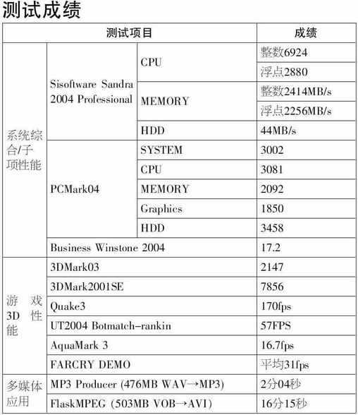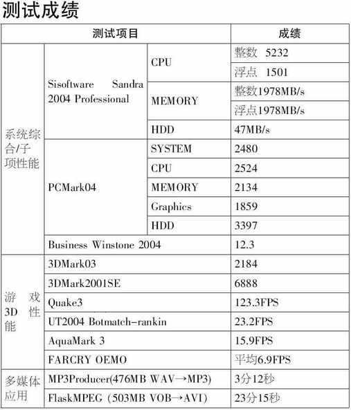 Intel处理器的测试平台配置如表2所示,而Athlon XP 2500+的测试平台与它类似,只是主板更换为硕泰克的KT880。测试平台的配置不算太高,就是想模拟普通用户的使用环境,来比较不同处理器的性能。