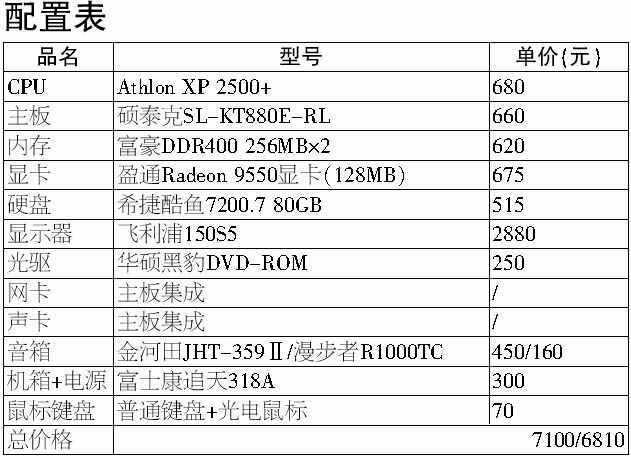 目前Athlon XP 2500+依旧很火,尽管是老产品了,但由于性能出色,价格便宜,所以,现在大部分配AMD系统的人依旧喜欢用这款CPU作为整台电脑的核心。前一阵儿出现过短期的缺货现象,原因一是因为买的人太多,二是因为AMD的渠道有点变化。现在这款CPU又大量上市了,不过大都是盒装的了,价格也涨了不少,但它的性价比依旧很高,所以还是热点产品。VIA的KT880开始支持双通道DDR400内存,而且搭配VT8237南桥后,可以支持SATA RAID。即使暂时不用SATA或RAID,它的整体磁盘性能相对nForce2 Ultra400还是有过之而无不及。所以,我们的这套配置以Athlon XP 2500+搭配KT880主板构建。现在内存价格已经下滑了不少,256MB 的DDR400仅要300来元,所以我们采用了2×256MB DDR400内存。