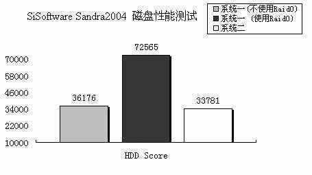 可以看到,在使用SATA硬盘组建Raid0后,系统的磁盘性能突飞猛进,几乎就是成倍地增长,效果非常明显,相信追求磁盘性能的玩家看到这个得分一定会非常感兴趣的。不过,ICH6R让我们感兴趣的地方还不止于此,Matrix Raid技术或许会开辟磁盘应用的新领域。